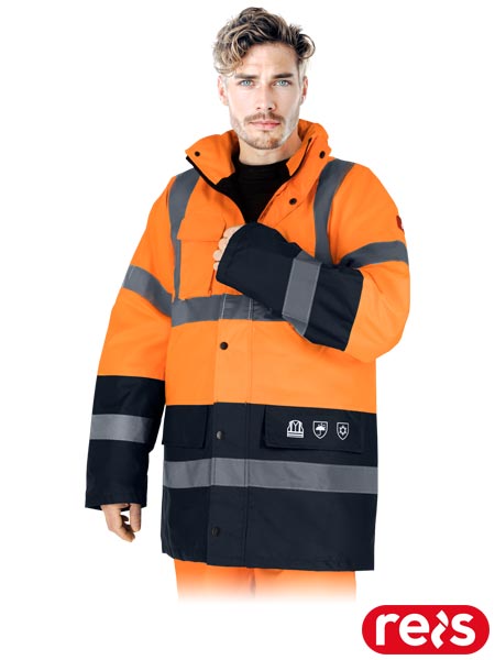 kurtka robocza ocieplana, REIS BLUE-ORANGE-J, kurtka ostrzegawcza, odzież BHP, kurtka zimowa do pracy, robocza kurtka z odblaskami, odzież ochronna, kurtka do pracy na zewnątrz