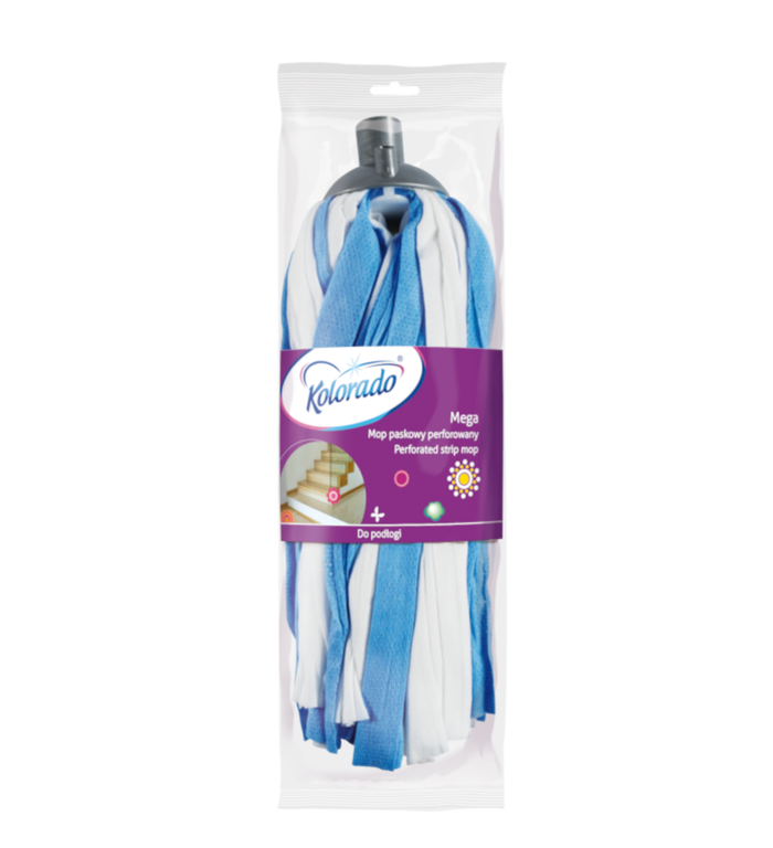 Mop paskowy Mega nadaje się do każdego rodzaju podłogi: drewnianej, z terakoty oraz paneli. Jego wielkość ułatwia i przyspiesza sprzątanie. Dzięki perforowanym paskom, jest bardziej chłonny od innych mopów.