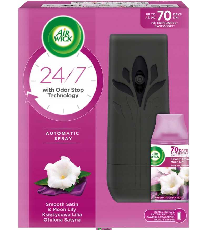 Automatycznie uwalnia nawet 2400 dawek zapachu. Wystarczy, że włączysz urządzenie, wybierzesz odpowiednią intensywność zapachu, ustawisz Air Wick Freshmatic w dowolnym miejscu i możesz cieszyć się bogatą paletą aromatów nawet przez 60 dni.