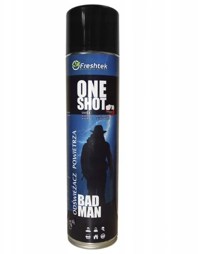 Freshtek One Shot Bad Man to silnie skoncentrowany odświeżacz powietrza w formie aerozolu, który skutecznie usuwa nieprzyjemne zapachy, pozostawiając intensywny, męski aromat inspirowany popularnymi perfumami. Jedno naciśnięcie spustu wystarcza do odświeżenia pomieszczenia o powierzchni do 200 m³.