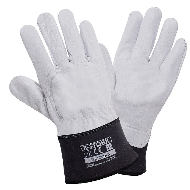 Słowa kluczowe: rękawice ochronne, Procera X-Stork, skóra kozia, mankiet drelichowy, gumka ściągająca, wypodszewkowane, EN 21420, ochrona dłoni, rękawice robocze, wysoka wytrzymałość.