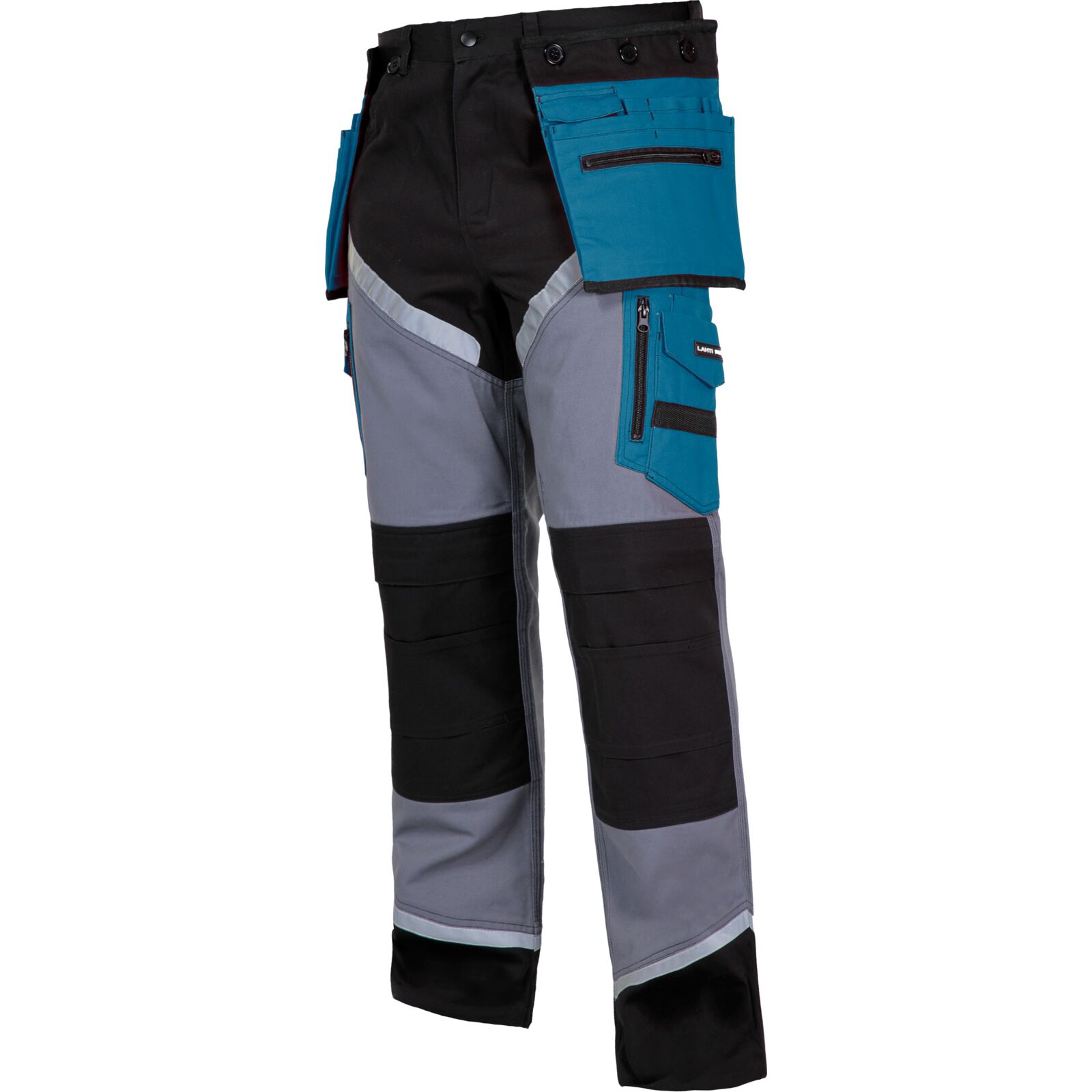 Spodnie L40502 to odzież robocza zaprojektowana z myślą o bezpieczeństwie i komforcie pracy. Połączenie kolorów czarnego, szarego i turkusowego, w połączeniu z pasami odblaskowymi, zapewnia nie tylko nowoczesny wygląd, ale również wysoką widoczność w warunkach słabego oświetlenia. Dzięki solidnej konstrukcji i zastosowanym materiałom, spodnie gwarantują trwałość i wygodę w trudnych warunkach roboczych.