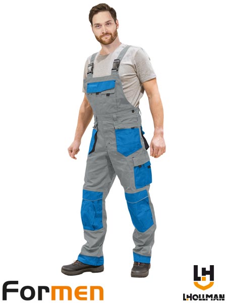 Słowa kluczowe: spodnie robocze LH-FMN-B ogrodniczki, ogrodniczki robocze szaro niebieskie, spodnie robocze z kieszeniami, odzież robocza BHP, spodnie robocze do pracy.