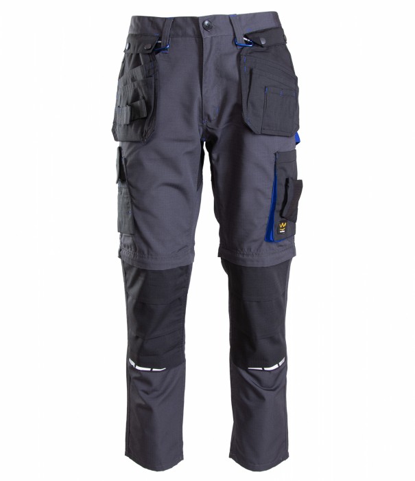 • 2w1 – długie spodnie i szorty – Możliwość odpięcia nogawek, co pozwala na dopasowanie ubioru do aktualnej temperatury i warunków pracy.
