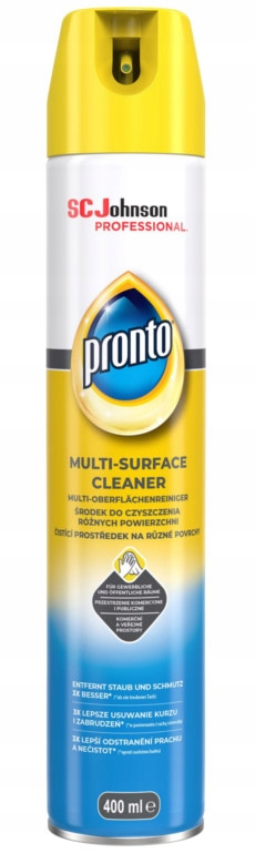 Pronto Multi Surface Cleaner jest antystatycznym preparatem w postaci sprayu do czyszczenia i pielęgnacji mebli. Preparat czyści i nadaje świeży zapach meblom drewnianym, w okleinie drewnianej i drewnopodobnej, jak również ze skóry naturalnej i sztucznej. Preparat nie pozostawia smug i zacieków. Można go stosować również do czyszczenia powierzchni kamiennych, metalowych, szklanych oraz sprzętu elektronicznego takiego jak zestawy Hi-fi, video, telewizory, ekrany komputerów itp. Specjalna formuła preparatu zapewnia niezwykle efektywne usuwanie kurzu oraz opóźnia gromadzenie się go na czyszczonych powierzchniach.