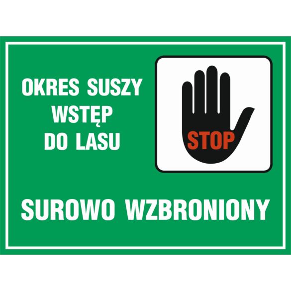 Znak „Okres suszy – wstęp do lasu wzbroniony” wykonany z płyty, służy jako ostrzeżenie o niebezpieczeństwie pożarów lasów w okresach suszy. Jest to istotny element informacyjny w miejscach narażonych na ryzyko wybuchu pożaru, szczególnie w lasach i terenach leśnych, gdzie łatwopalne materiały mogą szybko zapalić się pod wpływem nieodpowiedzialnych działań.